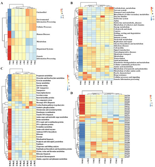 Using the annotation data (Supplementary Materials Figure S6B), the top ten functional annotations for the most abundant bacteria at each annotation level were retrieved, and a histogram of relative functional abundance was generated to visualize the relatively most abundant features at different annotation levels (Supplementary Materials Figure S6A). The identified KEGG pathway annotations mainly focused on cellular processes, environmental information processing, genetic information processing, human diseases, metabolism, and organic systems. Among them, metabolism had the highest proportion, and organic systems had the lowest proportion. Based on the functional annotation and sample abundance information, the top 35 abundance features and their abundances in each sample were used to generate a heat map, and clustered at the level of functional differences. On the horizontal level 1 of the clustering heat map (Figure 6A), the TW8 group had the highest proportion of organic systems and genetic information processing. On the horizontal level 2 of the clustering heat map (Figure 6B), biosynthesis of other secondary metabolites, metabolism of cofactors and vitamins, immune system, and glycan biosynthesis and metabolism had a higher level of function in the TW8 group than in the others. On the horizontal level 3 of the clustering heat map (Figure 6C), the abundances of exosome, purine metabolism, glycolysis/gluconeogenesis, alanine, aspartate, and glutamate metabolism, amino acid-related enzymes, peptidases, amino sugar and nucleotide sugar metabolism, etc., were only relatively high in the TW8 group. The TW8 group also had unique features in the horizontal level k of the clustering heat map (Figure 6D). The abundances of K03798, K03723, K02469, K03046, K03657, K05349, K06147, K01955, K01952, K03043, and K02337 were higher in the TW8 group than in the other groups. Overall, the TW8 group showed unique functional characteristics at levels 1, 2, 3, and k.