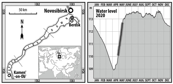 Sampling location and changes in water level of the Novosibirsk reservoir in 2020. Changes in the water level during the field study are highlighted in bold.