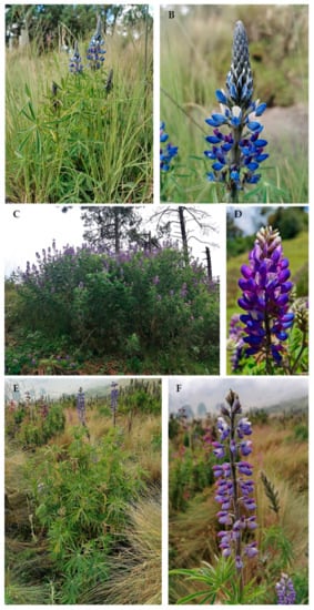 Lupinus aschenbornii (A,B), Lupinus bilineatus (C,D), and Lupinus montanus (E,F); (A,B,E,F) growing at the Iztaccihuatl–Popocatepetl National Park and (C,D) growing at Chichinautzin Corridor.