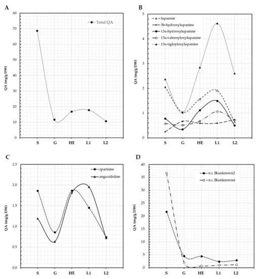 QA content in L. aschenbornii seeds and plantlets. Total QA (A), lupanine and its derivatives (B), other tetracyclic QA (C), unidentified QA (D). S: seeds, G: germination, HE: hypocotyl elongation, L1: emergence of first leaf, L2: emergence of second leaf.