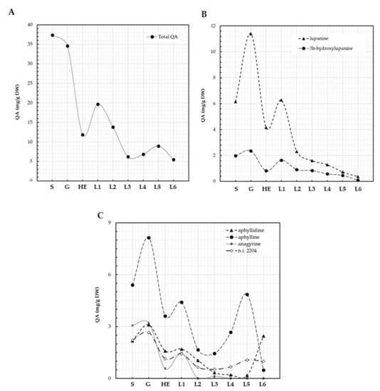 QA patterns of L. bilineatus seeds and plantlets. Total QA (A), lupanine and its derivatives (B), aphyllidine, and aphylline (C). S: seeds, G: germination, HE: hypocotyl elongation, L1: emergence of first leaf, L2: emergence of second leaf, L3: emergence of third leaf, L4: emergence of fourth leaf, L5: emergence of fifth leaf, L6: emergence of sixth leaf.