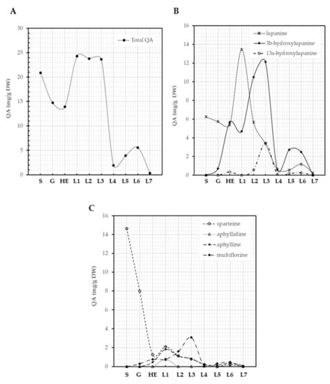 The main results of the present research are: (1) QAs were metabolized during germination—the main QAs were the most rapidly catabolized; (2) de novo QA biosynthesis starts once QAs are metabolized, for each evaluated species at a different developmental stage, suggesting that it is regulated in a species-specific manner; (3) structurally related QAs showed similar patterns of metabolization and biosynthesis, suggesting a common regulation; (4) there is no common QA pattern from which the diversity of QAs produced in these species is generated. Lupanine and 3β-lupanine were found in the three species, while sparteine was not present in L. bilineatus, excluding it as the precursor of more complex QAs;. (5) Lupinus montanus showed the most diverse QA pattern since it synthesized four different QA types: sparteine skeleton, lupanine and derivatives, aphylline and derivatives and multiflorine skeleton while Lupinus aschenbornii showed the most complex pattern of lupanine derivatives, what these changes in QA biosynthetic specificities mean in an evolutionary scenario is intriguing.