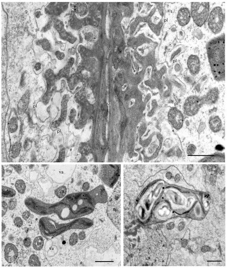 Ultrastructural details of placental cells taken in the TEM. (a) Transfer cells in gametophyte (g) and sporophyte (s) are separated by a narrow intergenerational zone (iz) and show elaborate cell wall labyrinths. An electron-lucent region is delimited by the plasmalemma (pl) and surrounds the dense inner core of cell wall ingrowths, which are more vesicular in the gametophyte. Mitochondria (m) and plastids (p) are located near wall ingrowths. (b) Plastids in sporophyte (s) cells are irregular in shape, dense, vesiculate, and contain few thylakoids. Mitochondria (m) and small vacuoles (va) are numerous in sporophyte cells. Note: n, nucleus. (c) Plastids in gametophyte (g) cells contain starch grains (s) surrounded by thylakoids. Note: m, mitochondria; n, nucleus. Scale bars = 0.1 μm.