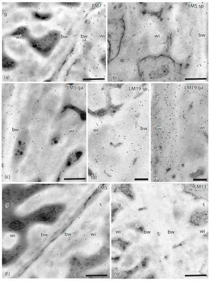 TEMs of Physcomitrium patens placenta showing immunogold labeling with monoclonal antibodies to pectin epitopes. (a) JIM7 labeled sporophyte (s) placental cell walls with more abundance than those in the gametophyte (g). Labeling occurred throughout the basal wall (bw) and the wall ingrowths (wi) on the sporophyte side. (b) JIM5 labeled the basal wall (bw) and wall ingrowths (wi) in sporophyte transfer cells. (c) JIM5 labeled the basal wall (bw) and wall ingrowths (wi) in gametophyte transfer cells. (d) LM19 labels were found in the sporophyte basal wall (bw) and wall ingrowths (wi). (e) LM19 labels on the gametophyte side were more abundant in both basal walls (bw) and wall ingrowths (wi) compared to the sporophyte cell walls. (f) LM5 and (g) LM13 sparsely labeled the basal wall (bw) and wall ingrowths (wi) in both the gametophyte (g) and sporophyte (s) placental cells. Scale bars = 0.5 µm.