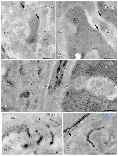 The LM15 hemicellulose MAb targeting xyloglucan sparsely labeled cell wall ingrowths in both generations (Figure 4a,b; Table 2). Galactoxylated xyloglucans, as localized with the LM25 MAb, were found in the basal wall and wall ingrowths in transfer cells in both generations, with fewer labels on sporophyte walls (Figure 4c,d). The LM21 MAb that is specific to mannans lightly labels both generations in electron dense areas near the basal wall layer and in wall ingrowths near the plasmalemma (Figure 4e). No labels were detected for the LM28 MAb.