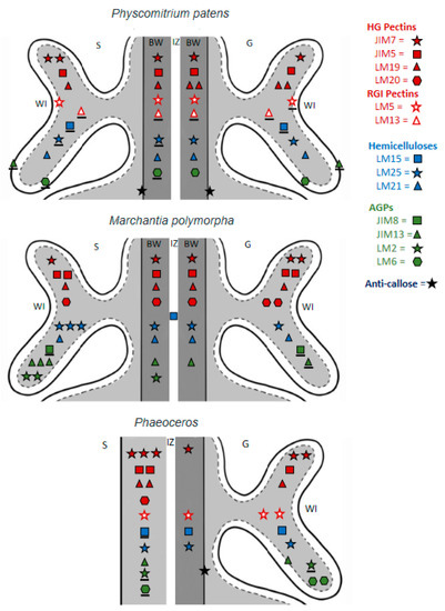 - Henry, J.S.; Ligrone, R.; Vaughn, K.C.; Lopez, R.A.; Renzaglia, K.S. Cell wall polymers in the Phaeoceros placenta reflect devel-opmental and functional differences across generations. Bryophyt. Divers. Evol. 2021, 43, 265–283. [Google Scholar]