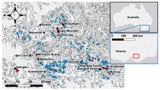 - Greet, J.; Harley, D.; Ashman, K.; Watchorn, D.; Duncan, D. The Vegetation Structure and Condition of Contracting Lowland Habitat for Leadbeater’s Possum (Gymnobelideus Leadbeateri). Aust. Mammal. 2020. First published online 16 December 2020. [Google Scholar] [CrossRef]