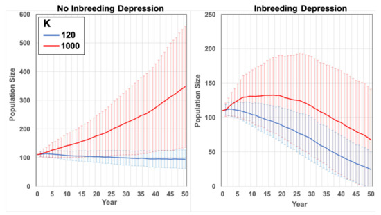 The influence of the limited carrying capacity and inbreeding on the lowland population size at Yellingbo since the 1990s was determined. A population of 110 individuals with all pairwise kinships equal to zero was simulated to represent the population in the 1990s, varying the carrying capacity to K = 120 and K = 1000. These scenarios were run using actual juvenile mortality estimates rather than those increased by 6% to achieve a demographically stable baseline in other scenarios. Simulations at these carrying capacities were run with and without inbreeding depression.