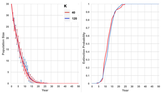 The time until extinction of the lowland population at Yellingbo without genetic rescue was estimated with simulations, starting with 35 lowland individuals alive in 2019 in the absence of supplementation and specifying pair-wise kinships, including inbreeding depression and as actual juvenile mortality rates (as for the 1990 Condition above). These simulations were carried out using two different carrying capacities; K = 40, representing the currently degraded habitat conditions, and K = 120, representing higher quality habitat present in the 1990s.