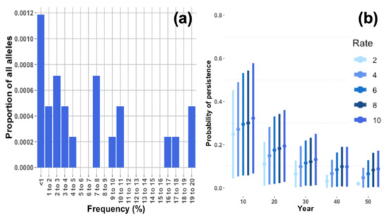 The overall mean retention probability for locally unique alleles was 0.29 (SD = 0.01) at 10 years of genetic rescue, declining to 0.06 (SD = 0.07) at 50 years (Figure 5b). When considered separately, the retention probability for alleles with starting frequencies >10% (Figure 6a) during genetic rescue were somewhat higher, with the highest mean retention probability after 10 years of genetic rescue being 0.68 (SD = 0.11) and the lowest 0.54 (SD = 0.10). After 50 years of genetic rescue, the highest retention probability at any translocation rate was 0.21 (SD = 0.05). For locally unique alleles with starting frequencies <10% (Figure 6b), the highest mean retention probability at 10 years of genetic rescue was much lower at 0.20 (SD = 0.16), with the lowest at 0.15 (SD = 0.12). The highest retention probability at 50 years was 0.04 (SD = 0.04).