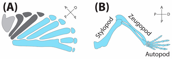 The majority of extant vertebrate diversity lies within the actinopterygian Teleostei and the sarcopterygian Tetrapoda, and both clades are characterized by the loss of one or more of the three ancestral A–P morphological regions (Figure 2). The paired fins of teleost fishes are polybasal [7]. Although Gegenbaur initially proposed that the fourth proximal radial of teleosts was a reduced metapterygial basal radial [5] (a hypothesis which has been repeated in modern times [3] and recently supported by compelling experimental data [10]), the more traditional interpretation is that teleost polybasal articulations are composed of only pro- and mesopterygial elements, and that the metapterygium has been lost, along with the ability to generate multiple long bones [11,12]. In contrast, tetrapod limbs possess a single element articulating with the supporting girdle (humerus of the forelimb; femur of the hindlimb). This arrangement of multiple long bones arranged along a single proximo-distal (P-D) axis has long been interpreted as retention of the metapterygium and loss of the propterygium and mesopterygium. In tetrapods, the metapterygium has become distinctly regionalized, along the P-D axis into the stylopod, the zeugopod, and the autopod (Figure 1B). Within these regions, the limbs of extant tetrapods follow a highly conserved osteological formula: in the stylopod, a single endochondrally ossifying element articulates with a supporting girdle (humerus or femur); in the zeugopod, two endochondrally ossifying elements (radius/ulna or tibia/fibula); and most distally, the autopod contains an array of many bones including the digits [13].