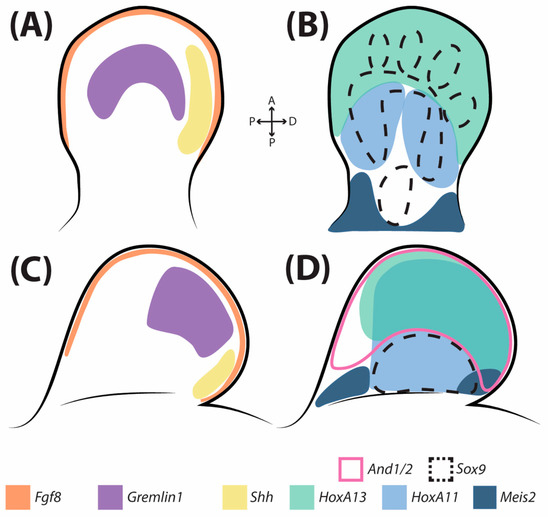 Fins and limbs are patterned by a conserved gene regulatory network (GRN). Representative limb ((A,B) mouse, Mus musculus) and fin ((C,D) paddlefish, Polyodon spathula) pectoral appendages. (A,C) Expression patterns demonstrate conserved aspects of the Shh–Fgf feedback loop, including Shh in the zone of polarizing activity (ZPA), Fgf8 expression in the apical ectodermal ridge (AER), and Gremlin1 in the appendage mesenchyme. (B,D) Expression patterns demonstrate conserved aspects of proximo-distal patterning via HoxA network components. Markers for the presumptive stylopod (Meis2), zeugopod (HoxA11), and autopod (HoxA13) are also present in fins, but without the distinct regionalization present in limbs. Expression of Sox9 and And1/2 marks the presumptive endoskeleton and dermatoskeleton regions, respectively. Illustrations not to scale; expression patterns adapted from References [21,22].