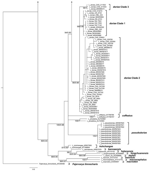Smith [18] associated Rana doriae with a group of species that all tend to develop a swelling or flap-like structure in the occipital region on top of the head as well as the presence of well-developed odontoids on the lower jaw on either side of the symphysis. Later, the species was transferred to the genus Limnonectes [12]. Ohler and Dubois [17] placed Limnonectes doriae in the subgenus Elachyglossa along with L. dabanus, L. gyldenstolpei (=the type species of this subgenus), L. kohchangae, L. macrognathus, L. maw-phlangensis, L. plicatellus, and L. toumano. Lambertz et al. [19] restricted the subgenus Elachyglossa to the four caruncle-bearing species of Limnonectes that were recognized at the time (i.e., L. dabanus, L. gyldenstolpei, L. macrognathus, and L. plicatellus). However, the phylogeny published by Phimmachak et al. [20] indicated L. kohchangae, L. macrognathus, and L. plicatellus to be more closely related to the non-caruncle-bearing species L. doriae, L. hascheanus, and L. limborgi than to the other caruncle-bearing species (i.e., L. dabanus, L. gyldenstolpei, L. lauhachindai, L. savan). Most recently, Yodthong et al. [21] described a new species related to L. doriae. Obviously, additional phylogenetic studies are needed including also nuclear DNA loci in order to resolve the relationships of the species of Limnonectes.