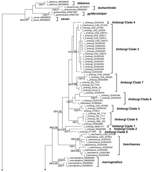 - Ronquist, F.; Teslenko, M.; Mark, P.; Ayres, D.; Darling, A.; Höhna, S.; Larget, B.; Liu, L.; Suchard, M.; Huelsenbeck, J. MrBayes 3.2: Efficient Bayesian phylogenetic inference and model choice across a large model space. Syst. Biol. 2012, 61, 539–542. [Google Scholar] [CrossRef] [Green Version]