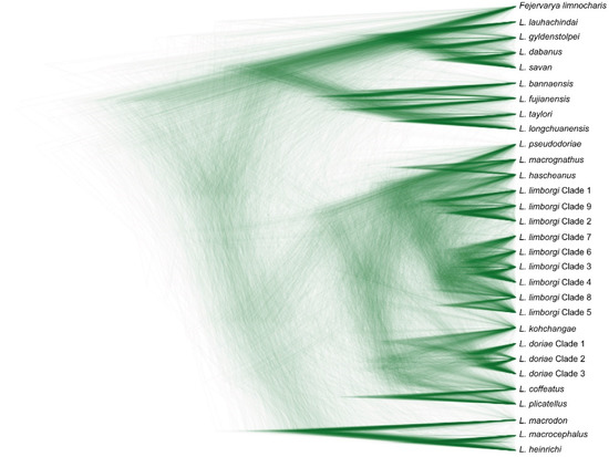 Species tree indicating phylogenetic relationships among frogs of the genus Limnonectes from a BEAST analysis showing density of trees proportional to frequency of occurrence drawn in DensiTree.