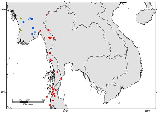In 1887, Boulenger [16] introduced his new species Rana doriae based on material he had obtained from Leonardo Fea. The geographic origin of the type series is given as “Thagatà Juwa; Kaw-ka-riet” (now called Kawkareik, about 66 km east of the city of Mawlamyine, northern Tanintharyi, Myanmar; see also [1]). The GPS coordinates for this locality were given as 16°33′ N, 98°14′ E [11]. Ohler and Dubois [17] restricted the geographic distribution of L. doriae to the Tenasserim region in Myanmar and adjacent Thailand on the Malayan Peninsula. However, Inger and Stuart [9] identified a specimen from Bago Yoma, Bago Region, Myanmar, as L. doriae.