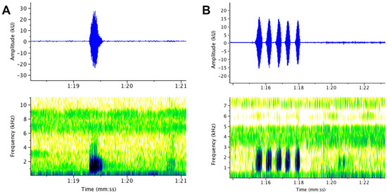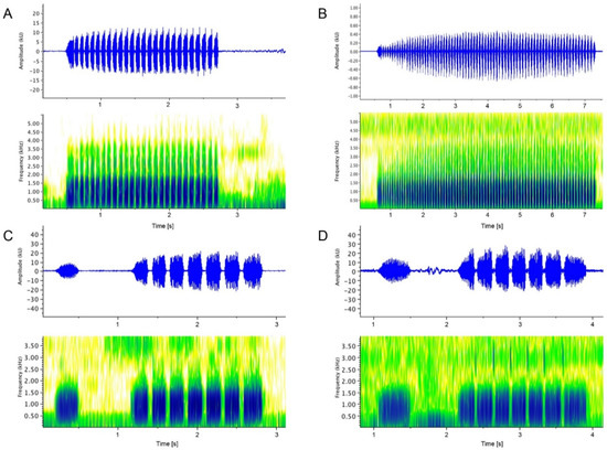 The spectral and temporal parameters were analyzed and the power spectra were calculated in RAVEN PRO 1.4. (Bioacoustics Research Program 2011). Spectrograms were obtained using the Blackman window function at 3db Filter Bandwidth of 158 Hz; grid spacing of 21.5 Hz; overlap 90%. Frequency information was generated through Fast Fourier Transformation (FFT, width 2048 samples). Temporal measurements of calls such as repetition rates, duration of notes, and the number of pulses, were measured on the waveforms. Terminology in call descriptions follows [28]. The map was created using ArcMap 10.4.
