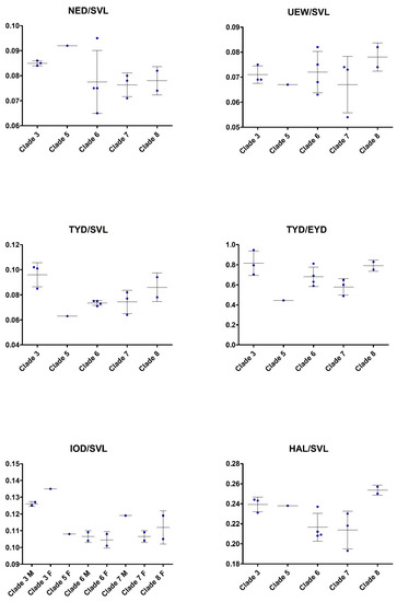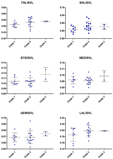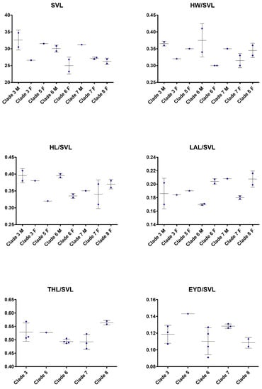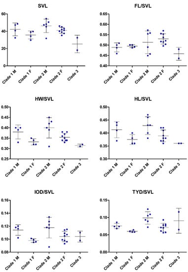 In external morphology, specimens of these five clades differ in details such as in the shape and orientation of the supratympanic fold, the development of the tarsal fold as well as in the amount of toe webbing, and in some details of coloration (see Table 3 and respective diagnosis sections below). Additionally, they show differences in some morphometric values (Figure 8), Finally, there is sexual dimorphism evident in several morphometric characters, most evident in relative head width.