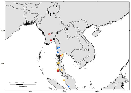 The methods and format of the presentation follow previous works coauthored by the senior author [2,5,22]. Specimens examined for this study were collected by GK, NLT, and PT (see Appendix A for specimens examined). Specimens labeled with GK field numbers were deposited in the collections of Senckenberg Forschungsmuseum Frankfurt (SMF) or at East Yangon University (EYU), Thanlyin, Myanmar, and those with PT field numbers were deposited in the collection of the Chulalongkorn University Museum of Natural History (CUMZ), Bangkok.