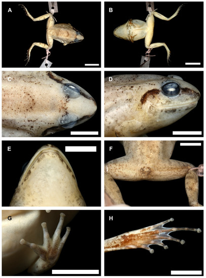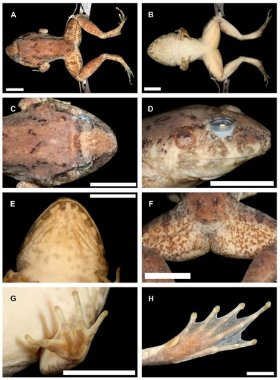 Holotype of Limnonectes bagoyoma n. sp. (SMF 106034). (A). dorsal view; (B). ventral view; (C). dorsal view of head; (D). lateral view of head; (E). ventral view of head; (F). cloacal and thigh region; (G). palmar surface of hand; (H). plantar surface of foot. Scale bars equal 5.0 mm. Photos by G.K.