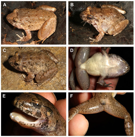 Limnonectes bagoensis n. sp. in life. (A) Male holotype, SMF 104090; (B) female paratype, SMF 104091; (C–F) male paratype, SMF 106038. Photos by G.K.