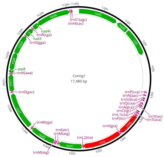 - Donath, A.; Jühling, F.; Al-Arab, M.; Bernhart, S.H.; Reinhardt, F.; Stadler, P.F.; Middendorf, M.; Bernt, M. Improved annotation of protein-coding genes boundaries in metazoan mitochondrial genomes. Nucleic Acids Res. 2019, 47, 10543–10552. [Google Scholar] [CrossRef] [PubMed]