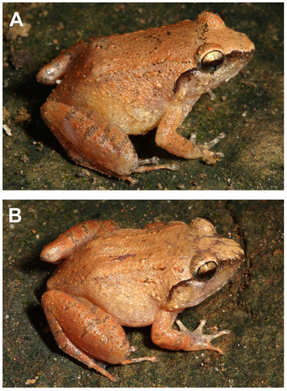 Limnonectes bagoyoma n. sp. in life. (A) Female holotype, SMF 106034; (B) Male paratype, SMF 106035. Photos by G.K.