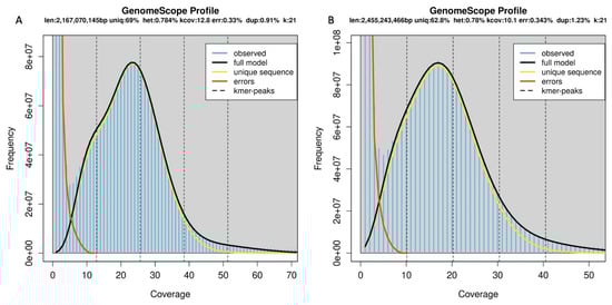 - Vurture, G.W.; Sedlazeck, F.; Nattestad, M.; Underwood, C.; Fang, H.; Gurtowski, J.; Schatz, M.C. GenomeScope: Fast reference-free genome profiling from short reads. Bioinformatic 2017, 33, 2202–2204. [Google Scholar] [CrossRef] [Green Version]
