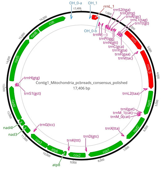 - Dierckxsens, N.; Mardulyn, P.; Smits, G. NOVOPlasty: De novoassembly of organelle genomes from whole genome data. Nucleic Acids Res. 2016, 45, e18. [Google Scholar] [CrossRef] [PubMed] [Green Version]