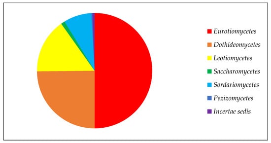 Among the classes of ascomycetous fungi, Eurotiomycetes has the largest number of strains due to the high representation of the genus Penicillium, with 241 strains in the collection (Figure 1). Next in number are the classes Dothideomycetes and Leotiomycetes, which have a special position in the study of the Arctic and Antarctic. Among the representatives of these classes, fungi show the greatest diversity, with a high frequency of occurrence in low-temperature ecotopes []. There are markedly fewer members of the class Sordariomycetes, and the classes Pezizomycetes and Saccharomycetes are represented by one or two genera.