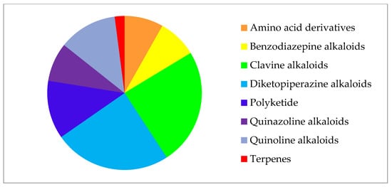 In general, most detected compounds (49%) belong to diketopiperazine and clavin alkaloids. Quinoline alkaloids and polyketides account for 12.2% each, and benzodiazepine alkaloids, quinazoline alkaloids, and amino acid derivatives are present in equal shares of 8.2%. One secondary metabolite (PR toxin) belongs to the terpene group (2%) (Figure 2).