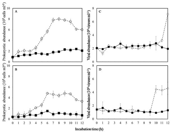 Temporal variations in prokaryotic and viral abundance at ambient (■), and warming temperature treatments (○) in November (A,C) and December (B,D), respectively. Vertical bars show ± standard deviations (n = 3).