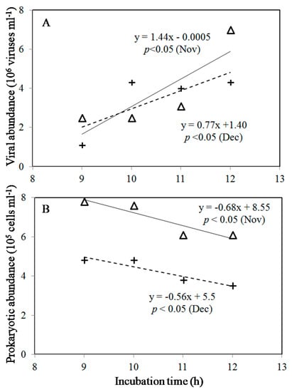 Relationships between viral abundance (A), prokaryotic abundance (B), and incubation time between 9 h and 12 h in November (△) and December (+). (—) and (– –) are regression lines for November and December.