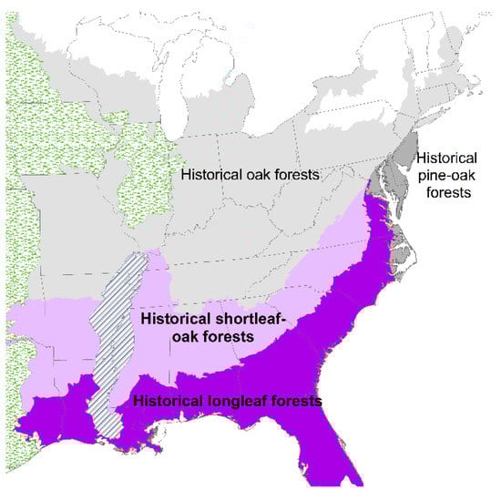 Fire-dependent open forests of savannas and woodlands historically were dominant in the southeastern United States, where fires typically occurred every 2 to 15 years at any given place [,,] of Figure 1. Longleaf pine was the foundation species (>75% of all trees) in the southern ecological province of the southeastern region, although this included some percentage of other, less fire-tolerant pine species that may have been dominant in localized areas [,,,]. Longleaf pine forests historically were dominant across about 30 million ha []. Shortleaf pine, at about 35% of all trees (including some other pine species), combined with several fire-tolerant oak species (e.g., Q. stellata), comprising 40% of all trees, were the foundation genera of the northern province of the southeastern region []. These dominant species defined the ecosystem, determined abiotic conditions, and supported biological communities [,]. Open longleaf pine forest specifically remains known for associated biodiversity, with 150 to 300 grass and forb species per hectare, including rare and 1630 endemic plant species, although some of the same species were supported by open forests throughout the eastern United States [,,].
