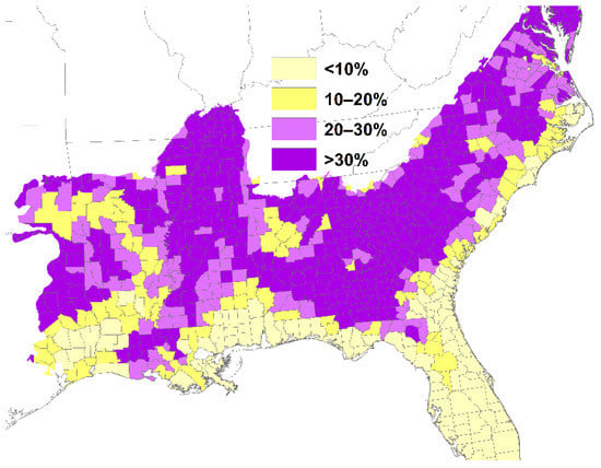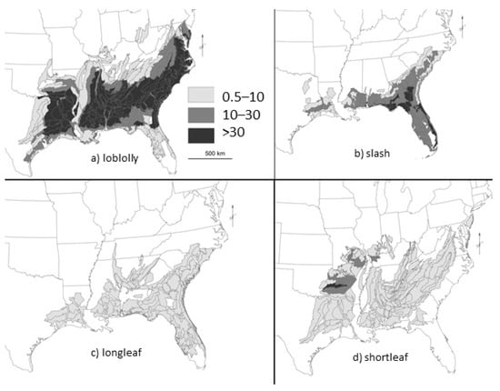 The southeastern United States now is the greatest producer of forest products worldwide due to the long growing season and intensive management that allow the full cycle from pine planting to harvest to occur within 20 to 25 years []. Pine plantations have become progressively more common since 1950 [,], reversing conversion to broadleaf forests in the southeastern region (Figure 3). In the southeastern U.S., pine plantations covered 0.8 million ha in 1952, 8.5 million ha in 1987, 12 million ha in 1999, and 17 million ha in 2017 [,,,]. Pine plantations generally consist of loblolly or slash pine that are the most profitable species, particularly in marginal lands for agriculture, although plantations of shortleaf and longleaf pine occur when multiple objectives (e.g., wildlife, hunting) are of interest to landowners [,].