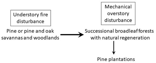 In the United States, frequent burning by Native Americans and lightning-ignited fires were a driving process in shaping the composition and structure of many ecosystems for millennia (Figure 1). One of the first observations in Euro-American historical accounts was that native humans burned wildlands []. Indeed, Euro-American settlers typically adapted native burning practices and some settlers may have experienced fire as part of pastoral management before emigration [,,]. Nonetheless, forests were harvested rapidly due to steam power, railroads, and inexpensive land prices starting about 1860. By 1920, most forestlands in the United States either were cleared or disturbed by harvest for wood products, and additionally, fire exclusion became institutionalized. Although other drivers such as climate and herbivory, or a combination of factors, have been invoked to explain states and state transition, fire exclusion is a key mechanism that holds up to available evidence for the eastern United States during the past thousands of years, after extinction of almost all megaherbivores [].