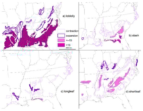 Range dynamics are complex and vary in shape due to multiple attributes, including areal extent, density, spatial variation, discontinuities, and user-defined thresholds and spatial units. An idealized range, at least based on range maps from pollen studies of tree response to changing climate, is continuous with greater densities toward the center of the range, so that movement along a leading edge is easily measured. But all of the pine ranges were discontinuous, and in particular, disrupted by the floodplains of the Mississippi River Alluvial Valley (Figure 1). Pine species, in general, do not have the traits to compete well against angiosperm tree species in fertile alluvial soils or against flood-tolerant tree species in floodplains. The Mississippi River Alluvial Valley also has been converted to agriculture, a land use that fragments tree distributions, and likely more pines have been planted in the Lower Mississippi River Alluvial Valley than occurred historically during the 1800s []. Different ecological features, whether floodplains or mountains, will divide ranges, regardless of land use. Additionally, each of the pine ranges had unique spatial variation in relative densities, ranging from relatively uniform for longleaf pine to greater percent composition in the northwestern part of shortleaf pine’s range. Range contractions for longleaf pine during the study interval, although disjunct, were spread evenly across the Coastal Plain. In contrast, shortleaf pine range is concentrated on the west side of the northern province and range contractions occurred to the east of the densest portion of shortleaf pine range. Loblolly pine, a major commercial pine species, expanded and increased in composition but conversely, the other major commercial species, slash pine, contracted in range but increased in percent composition where it was planted.
