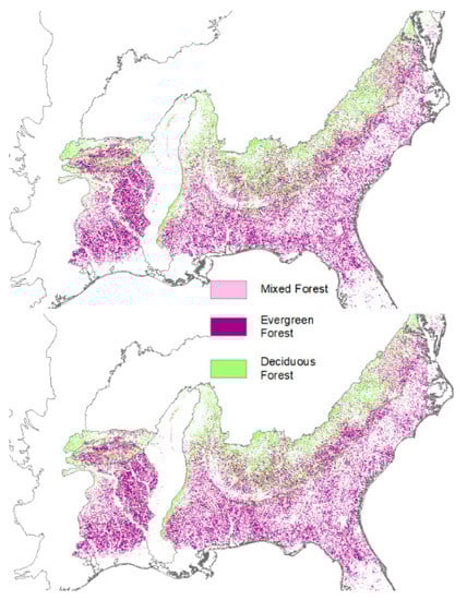Loblolly pine has become the most abundant species, totaling about 35% of all trees, in the southern province of the southeast region. Slash pine is the second most abundant at about 13% of all trees. And, in the northern province of the southeast region, loblolly pine has become the most abundant species, at about 42% of all trees. Current range for loblolly pine is 126 million ha (Figure 4; range defined here as where a species is present at ≥0.5% of all trees in an ecological subsection, which are smaller ecological units []. Loblolly pine expanded 9 million ha in range, while area where loblolly was present at ≥30% of total species composition almost tripled, increasing from 24 million ha to 64 million ha, a total increase of by 40 million ha (Figure 5). Range for slash pine was 41 million ha, a decrease of 21 million ha, although mean percent composition within its range increased. Northern Florida is the center of slash pine plantations and increased composition from plantations offset percent composition decreases and contraction in slash pine’s northern range.