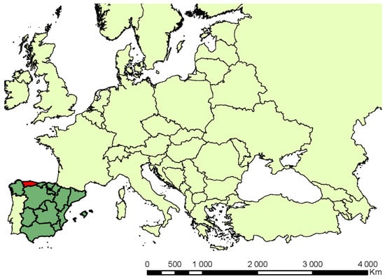 Geographical situation of the Principality of Asturias (red) in Spain (dark green) and within Europe.