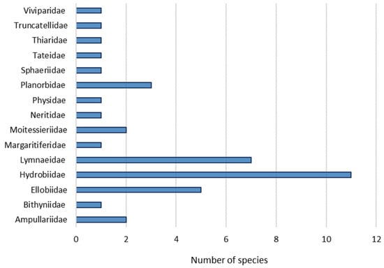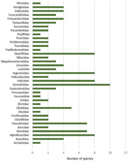 A total of 165 molluscs species has been recorded in the Principality of Asturias. The malacological fauna is composed by 138 snails (83.6%), 25 slugs (15.2%) and two mussels (1.2%) (Table A1 and Table A2). Among snails, there are 37 aquatic species (26.8%) (Table A1) and 101 (73.2%) with terrestrial habits (Table A2).