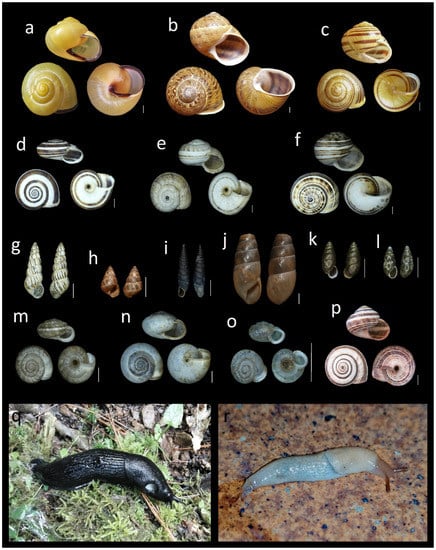 Land and freshwater snails and slugs are mostly heterobranch gastropods (except for some operculate snails that are caenogastropods) inhabiting many different inland habitats worldwide. Overall continental gastropods and bivalves play important ecological roles as prey for many species of birds and small mammals, predators of other invertebrates or as scavengers or filter-feeding organisms. Furthermore, they have attracted attention in the last decade not only for its surprising and unknown diversity [,,,,] but also for other aspects, from being indicators of climate change and evolutionary responses (e.g., Cepaea nemoralis) to a sentinel species of wetlands, ponds, and streams environmental quality [,]. Some species of land snails and slugs eat plants, including vegetables, fruits and garden flowers and thus they can destroy young plants, ruin crops and constitute an important pest in many countries [,]. Other species feed on another invertebrate groups such as earthworms and flatworms or even on other snails or slugs [,].