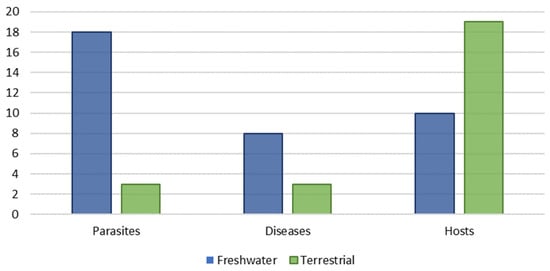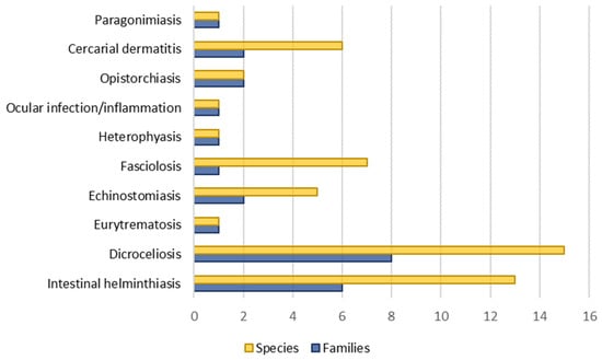 Many species of parasitic worms (called ‘helminths’ in medical-veterinary terminology) are responsible for several of the most worldwide prevalent parasitosis (e.g., hookworms or schistosomiasis). ‘Helminth’ is a term which groups animals distributed among three phyla: Nematoda, Platyhelminthes and Acanthocephala []. However, helminth- caused diseases have suffered a lack of attention on the part of medicine and human sociology []. The trematodes are divided into two subclasses: Digenea Carus 1863, the one with the greatest medical and veterinarian importance [] and Aspidogastrea Faust & Tang, 1936. Digenea flatworms (commonly known as ‘digestive flukes’) include about 9000 species that can parasitize both humans and domestic animals and can be found thoughout the entire body, from the digestive tract and bile and pancreatic ducts to the lung circulatory and genitourinary system [,].