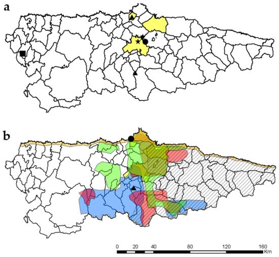 Several seasonal samplings were carried out throughout the Principality of Asturias (2010–2020, Figure 1) looking for molluscs (details of collection date and locality are specified in the respective species sections in ‘Results’ for the new records). In addition, the material from the Collection of the Department of Organisms and Systems (BOS) of the University of Oviedo, in which several mollusc species from previous studies are stored [,,], was revised. For the elaboration of the mollusc checklist, an exhaustive review of the Asturian available bibliography was carried out. The species status was assigned following the guidelines of the International Union for the Conservation of Nature (IUCN). A ‘native species’, ‘autochthonous’ or ‘indigenous’ species is one original from a specific geographical site (here, the Principality of Asturias) without human intervention of any kind. Terms of ‘introduced species’, ‘exotic’, ‘alien’ or ‘non-native’ refer to that species introduced by humans (intentionally or not) outside its present or past range of distribution. Furthermore, an ‘invasive alien species’ is considered that species established outside its range of natural distribution, both present and past, whose introduction and/or expansion supposed a threat to indigenous biological diversity. In addition to these terms, the term ‘cryptogenic species’ refers to a species without certainty about its native or introduced origin, due to a lack of study or other impediments []. The European distribution of molluscs was obtained from Welter-Schultes [] and the Iberian ones from Cadevall and Orozco [] and our own observations. The ecological data of the Malacofauna was obtained from Cadevall and Orozco [] and our own observations. The list of trematodes was obtained through a literature review of trematodes associated with all the potential intermediate host species in the Principality of Asturias of molluscs. Only those trematode species with confirmed cases of infection in humans (i.e., trematodiasis) were considered to cause disease. Distribution maps were generated with ArcMap 10.8.1 (ArcGis, Redlands, CA, USA).