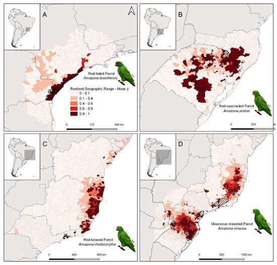 The future of the four parrot species analyzed in this study is threatened by two key environmental hazards: habitat loss and human exploitation [2]. A. brasiliensis, A. pretrei, A. rhodocorytha, and A. vinacea are all impacted by the destruction of the Atlantic Forest, especially because they nest in tree cavities that are much more common in old growth than in secondary forests [90]. Since the arrival of Europeans in South America, almost 90% of the original Atlantic Forest cover was lost [12]. The remaining forest is highly fragmented, with only 20% of its area contained in patches larger than 100 km2, and 83% of the patches being smaller than 50 hectares [12]. When not replaced by pasture or farmland, cleared forest gives way to exotic tree monocultures, such as Pinus and Eucalyptus [91]. In coastal areas intensely used by the tourism industry, cleared forests may also give way to urban expansion, which disproportionally affects A. brasiliensis [29]. The other primary threat to all four species, human exploitation, comes in the form of nest poaching [8,69,74,92,93,94,95,96]. According to one study [8], nest poaching is the principal cause of nest failure for A. vinacea—with more than 80% of 25 monitored nests poached—and A. brasiliensis—with 50% of 78 monitored nests poached. Four initiatives have been promoting conservation, as well as research and monitoring of the four species throughout the last three decades: Projeto Charão (for A. pretrei, since 1991), Projeto para Conservação do Papagaio-de-cara-roxa (for A. brasiliensis, since 1997), Projeto Chauá (for A. rhodocorytha, since 2014), and the Programa Nacional para a Conservação do Papagaio-de-peito-roxo (for A. vinacea, since 2015). To improve knowledge about population dynamics and manage a response to environmental threats, it is essential that these and similar initiatives expand their reach. Continued tapping of citizen-science data will help to update knowledge about species’ ranges. The estimation of abundance and validation of range maps, however, require observers on the ground. Much can be achieved just by sending observers to municipalities with higher uncertainty about species’ occurrence, but one can go much further by practicing integration of citizen-science and professional research work on a routine basis. The combination of range mapping based on citizen-science and coordinated observation by research teams throughout the species’ ranges offers a powerful tool for accurately monitoring the species’ status and for assessing the consequences of management decisions.