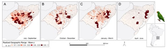 Seasonal variation of the geographic range of the Red-Spectacled Parrot (Amazona pretrei) as shown by the mean of the true occupancy state () estimated for each municipality. Each panel represents a trimester, the sequence starting with July–September (A), when the species is most dispersed, and proceeds in three-month intervals to October-December (B), January-March (C) until April–June (D), when it aggregates in only a few municipalities. Darker tones of red indicate higher mean ; intermediate tones indicate the highest uncertainty about species presence.
