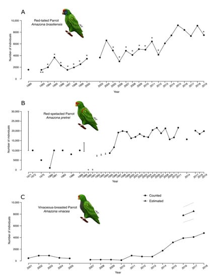There is much less information about the abundance of Atlantic Forest Amazona species than about their geographic range. The species for which we could assemble the longest time series of roost counts was A. pretrei, which has a long-term monitoring program led by the same team of researchers since the mid-1990s (Figure 3B). A. pretrei is also the species with highest counted number of individuals. Its earliest counts, performed in 1971 by Forshaw and Cooper (ref [36] cited by [37]), returned between 10,000 and 30,000 individuals (Figure 3B). Later, during the 1970s and 1980s, Belton [38] and Varty et al. [37] reported a decline in the number of individuals counted, with recovery during the 1990s. Since 1997, the yearly sum of A. pretrei counts has varied around 20,000 individuals (Figure 3B) [39,40,41,42]. The second longest time series of roost counts is that of A. brasiliensis. This species also has an ongoing monitoring program, coordinated by the same team throughout the last two decades [43]. The sum of A. brasiliensis counts has varied, always below 10,000 individuals, over the last three decades [28,29,43,44,45,46,47,48,49,50,51,52,53,54,55,56,57,58,59,60,61]. Figure 3A shows a tendency towards increasing counts, but one should not rush to interpret this as evidence of population growth because the count reports do not incorporate corrections for variation in effort through time. A. vinacea has the shortest time series of roost counts [21,27,42,62,63,64] (Figure 3C) but is the only species with a published statistical estimate of population size, which does account for temporal changes in sampling effort, as well as for detection errors [21]. There are two estimates, for the non-breeding seasons of 2016 and 2017, both in the vicinity of 8500 individuals and with 95% credible intervals entirely below the 10,000-individual mark.