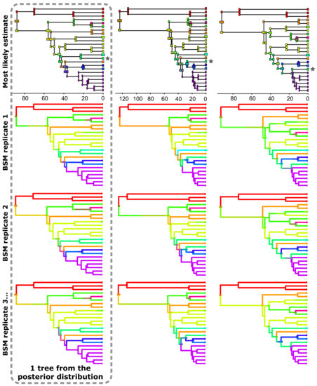 In addition to phylogenetic uncertainty, there is the uncertainty associated with stochastic time-continuous models such as DEC. Because of this, estimates for ancestral nodes might include several possible states, each with its own probability. This hampers counting biogeographic events or estimating their ages. Dupin et al. [2] solved this by introducing biogeographic stochastic mapping (BSM), a method to count biogeographic events while accounting for uncertainty in ancestral range estimation. Several replicates are run, and in each one the states at each node are resolved by taking into account the probabilities of each state. This allows, for instance, counting the number of dispersal events among areas, or estimating the time when such transitions took place. This approach is elegant, but it is usually employed on estimates based on a single tree, and thus incorporates uncertainty on ancestral range estimates conditional on a single topology. If there is topological uncertainty leading to different ancestral range estimates, this approach will underestimate the uncertainty in the biogeographic reconstruction (Figure 1). Furthermore, using a single tree as input ignores the confidence intervals in age estimates, which are usually large. We argue that it would be productive to run stochastic maps over a sample of trees to incorporate both phylogenetic and stochastic uncertainty simultaneously. This approach has been successfully implemented to estimate dispersal rates among areas through time in some studies (e.g., [27,28,29]).