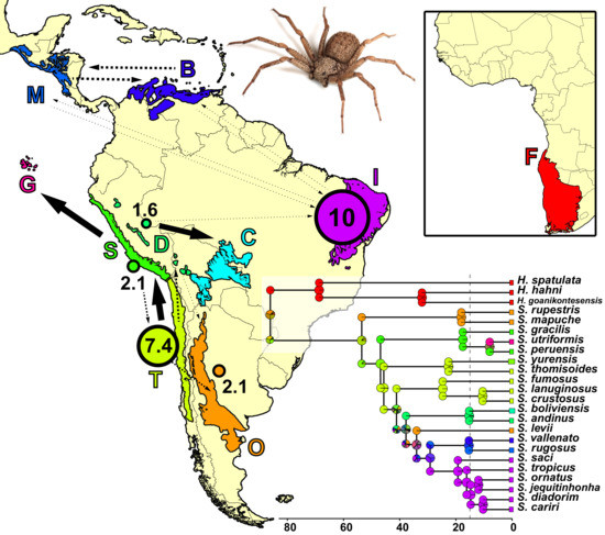 - Binford, G.J.; Callahan, M.S.; Bodner, M.R.; Rynerson, M.R.; Núñez, P.B.; Ellison, C.E.; Duncan, R.P. Phylogenetic relationships of Loxosceles and Sicarius spiders are consistent with Western Gondwanan vicariance. Mol. Phylogenet. Evol. 2008, 49, 538–553. [Google Scholar] [CrossRef] [PubMed]