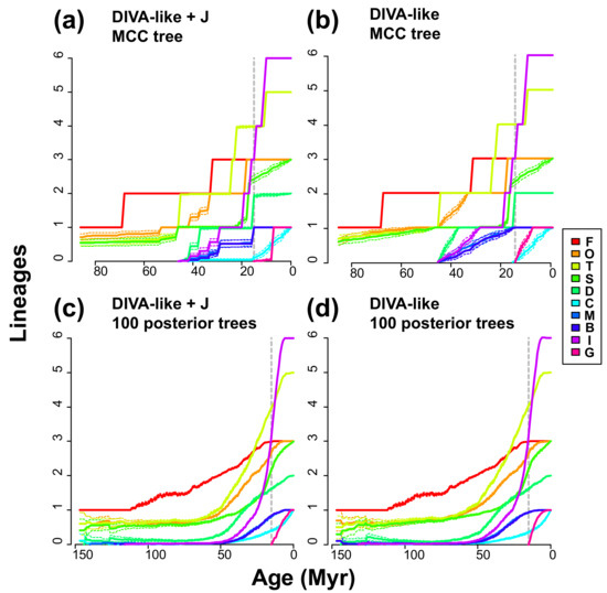 Number of lineages occupying each area through time. Solid lines are the average of 100 biogeographic stochastic maps, and dashed lines are the 95% confidence interval. See Figure 2 for area abbreviations. The dashed vertical line indicates the boundary between time slices in the time-stratified analysis. Runs on a single maximum clade credibility tree (a,b) show abrupt changes in the number of lineages that are related to cladogenetic events, whose age does not vary because there is no uncertainty associated to the tree. This effect is more pronounced in the model with founder-event speciation (a) because it relies more on cladogenetic events for estimating ancestral ranges. Using several trees (each with 100 stochastic maps) to account for topological and age uncertainty removes this effect and smooths the curves (c,d), reducing differences between models with and without founder-event speciation.