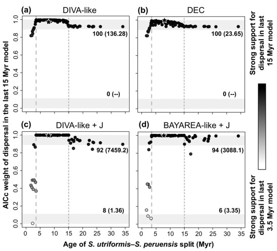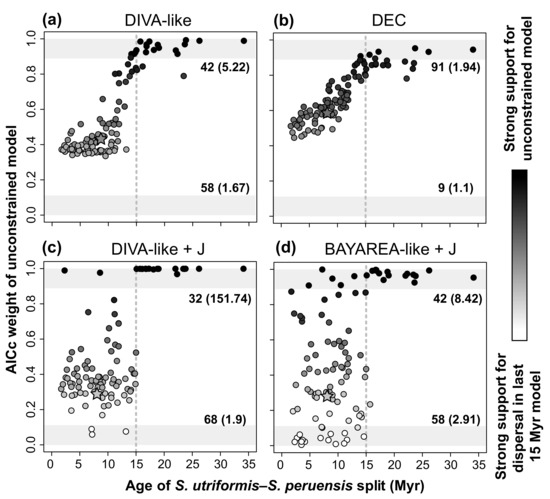 We suspected that this pattern might be due to the age of split between S. utriformis–S. peruensis. The confidence interval of this age spans a wide range (1.2–22.2 Myr) and actually crosses the boundary between the two time slices of the time-stratified model (15 Myr). To investigate this, we plotted the AICc weight of the unconstrained model against the age of the split (Figure 5). The plot indicates that when the age of the split is younger than 15 Myr, there is weak support for the time-stratified model (DIVA-like and DIVA-like + J), to the unconstrained model (DEC), or the support to either of them is ambiguous (BAYAREA-like + J). On the other hand, the data fit better to the unconstrained model in all the 17 trees where the S. utriformis–S. peruensis split is older than the boundary of the time slice (15 Myr). While this is true for the four biogeographic models employed, the effect is much stronger in models including a founder-event speciation parameter, which tend to favor the unconstrained model more strongly: the relative support for the unconstrained model is higher in DIVA-like + J (776.2 ± 369) and BAYAREA-like + J (85.7 ± 110.86) than in DIVA-like (37.81 ± 37.97) and DEC (8.84 ± 4.73). Thus, in at least some of the trees from the posterior distribution, there is strong support for an unconstrained colonization of the Galapagos taking place before 15 Myr.